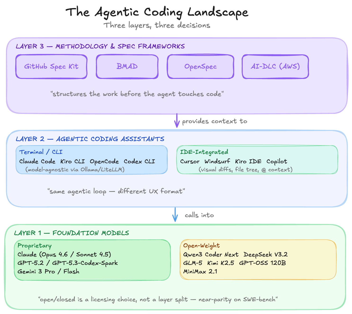 If you are starting from zero: pick a model (Claude Sonnet 4.5 or Opus 4.6 for the path of least resistance; Qwen3 Coder Next or GLM-5 if data sovereignty matters and you want to run on Bedrock or on-premise), pick an agent runtime that matches your team’s workflow (Kiro if you want AWS integration and spec-driven support baked in; Claude Code if you want the most mature CLI agent — and note it supports open-weight models via Ollama or LiteLLM if you want to swap the backend; OpenCode if you want a fully open-source runtime with no platform dependency), and adopt AI-DLC or Spec Kit as your methodology layer for anything more complex than a single-file change.
