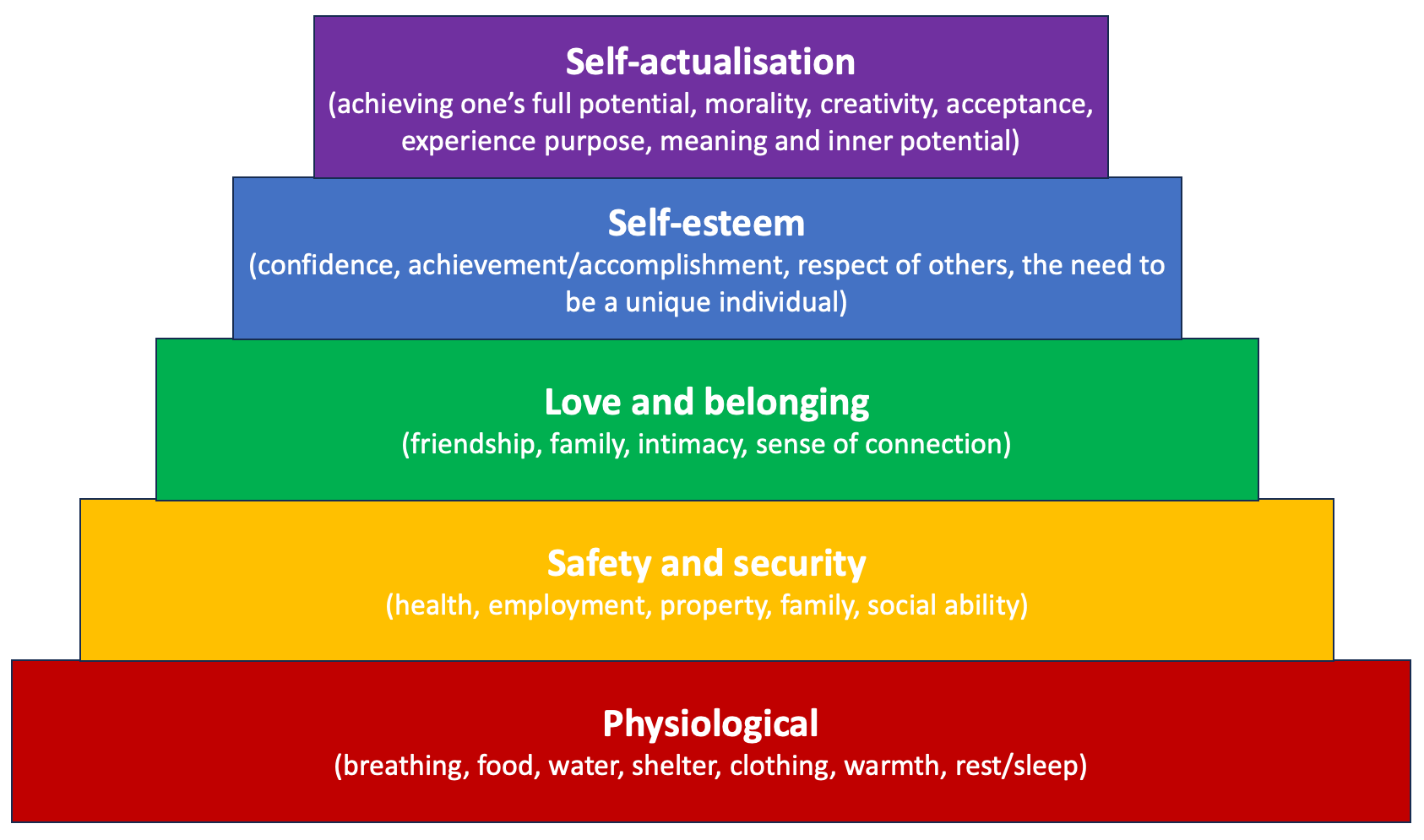 This post is a reminder on a classic psychology theory by Abraham Maslow: a hierarchy of needs. It is normally illustrated as a pyramid, with more basic needs at the bottom. The pyramid represents an idea that in order for a human to move forward (ie. “go to the next stage in life”), the prior stage must be satisfied first.