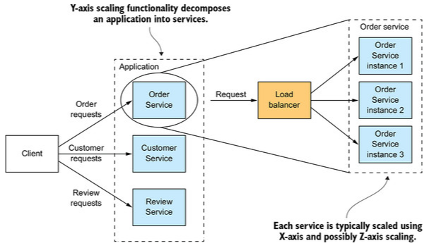 Pendekatan ini tidak hanya menyelesaikan masalah capacity dan availability sebuah aplikasi, tetapi juga melakukan scaling sebuah tim (organisasi). Setelah kita melakukan scaling dengan pendekatan sumbu Y, kita masih bisa melakukan scaling lebih lanjut dengan melakukan pendekatan scaling sumbu X dan Z seperti pada ilustrasi berikut.