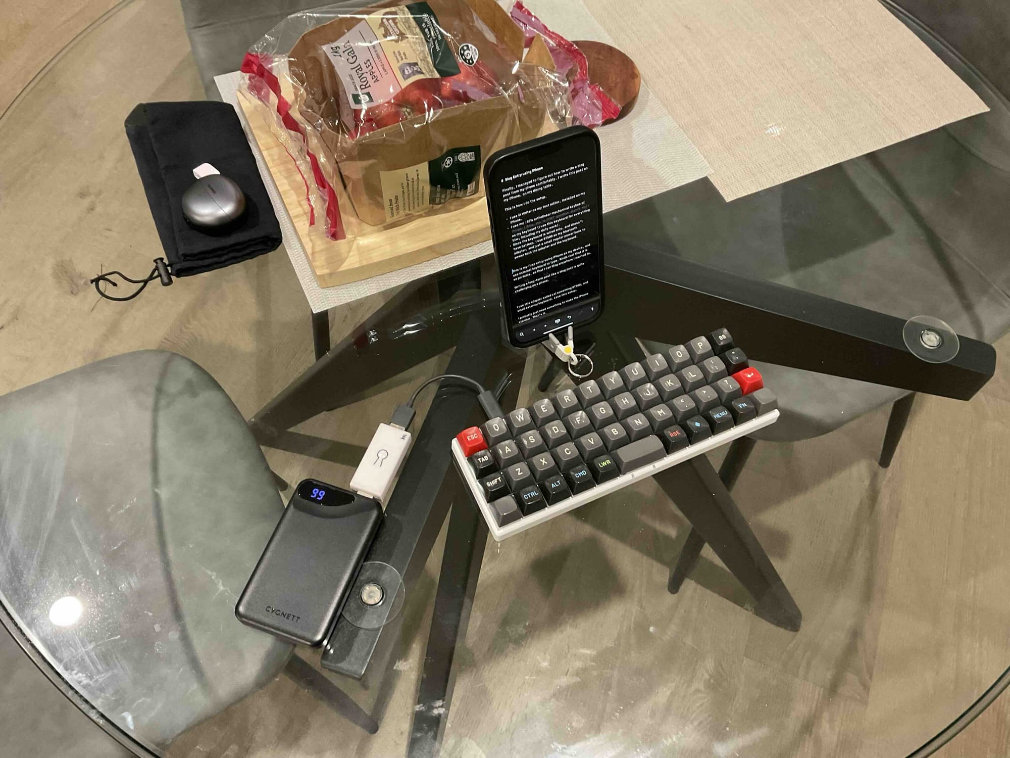 Writing a long-form post like a blog post is quite challenging on a phone. This setup by no means is perfect, but this is much better than typing on the screen. I can now write anywhere, anytime I want, without having to carry my iPad or my laptop.